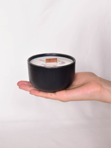 Vela aromática contenida en envase de cerámica, hecha por manos colombianas de forma artesanal.