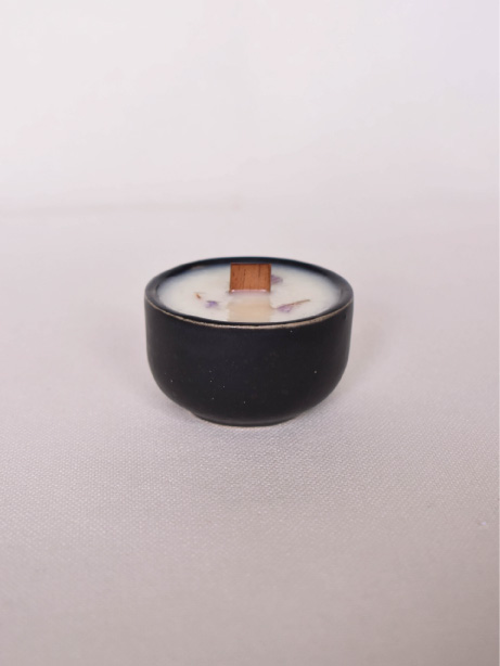 Vela aromática contenida en envase de cerámica, hecha por manos colombianas de forma artesanal.